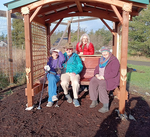 Friends of Jo and George Yount gather to dedicate the bench to the vision Jo had back at the beginning, to create a garden in which to grow food to feed the community. Her vision stands today as the Quimper Grange Food Bank Garden, or "Jo's Garden" as it's fondly known as, harvests throughout the year to supply our local food bank with fresh produce. The trellis and bench were lovingly crafted and donated to the Garden by Community Boat Project.